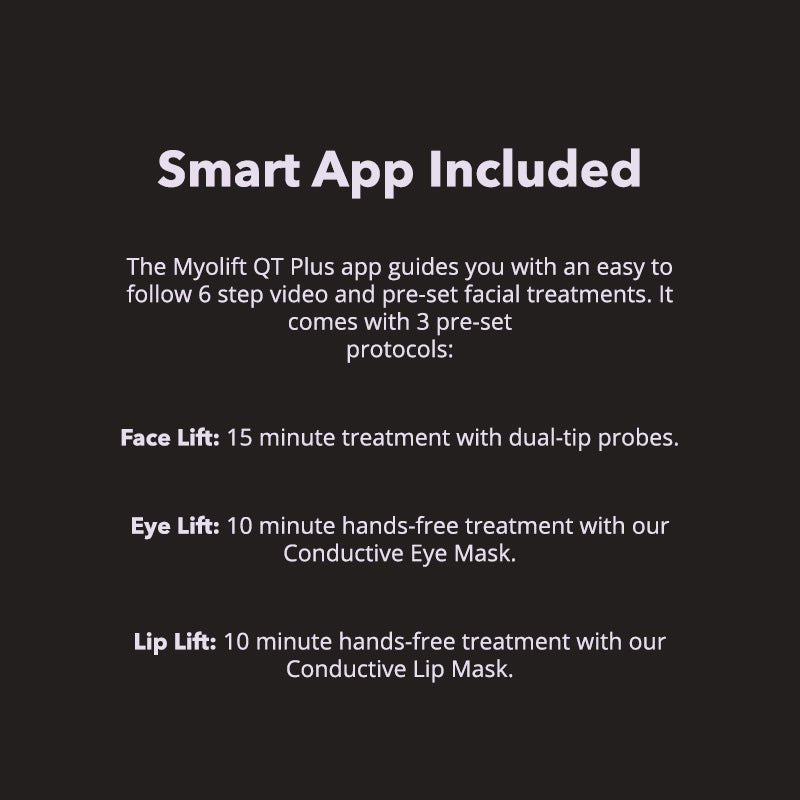 Myolift QT™ is designed with Smart Current™ Dynamics. Myolift QT™ is the next level of elevated modern microcurrent technology with mobile app functionality! QT takes the guesswork out of complicated microcurrent devices by providing pre-set facial treatments conveniently stored in the Myolift QT™ app on your smartphone.