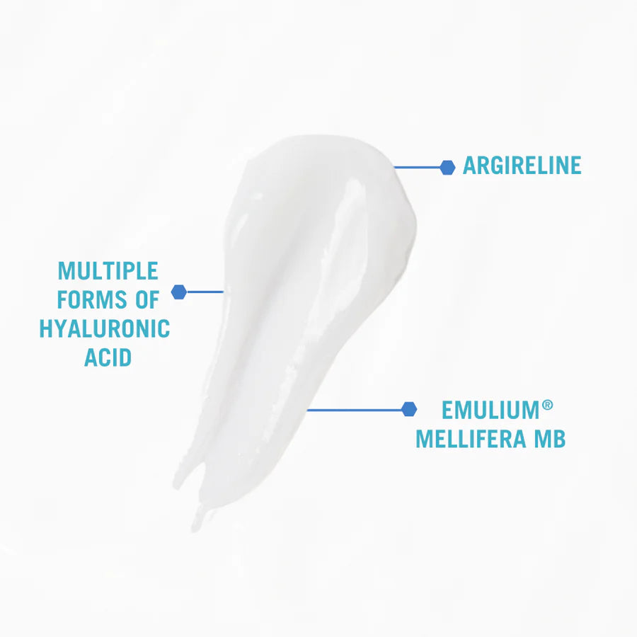 Promote deep hydration and strengthen your skin from within. Low molecular weights of hyaluronic acid penetrate the epidermis and dermis, encouraging the skin’s natural production of hyaluronic acid to improve elasticity and moisture retention over time. With the added power of Argireline, a neuropeptide, fine lines and wrinkles are visibly reduced, preventing the repetitive movements that lead to expression lines like crow’s feet, forehead lines, and smile lines.